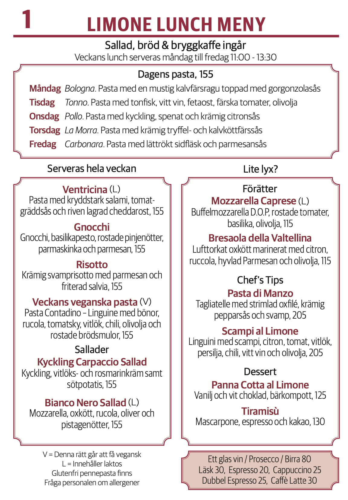 Äta lunch hos oss på Limone kostar 155 kr inkl sallad och kaffe.